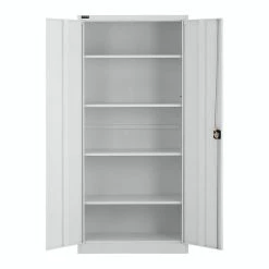 Der abschlieĂźbare Aktenschrank mit viel Stauraum fĂĽr Ihren ArbeitsplatzDer abschlieĂźbare Aktenschrank von Fromm & Starck bringt Ordnung in Ihr BĂĽro oder Ihre Werkstatt. Darin werden wichtige Unterlagen sowie unentbehrliches Arbeitsmaterial sicher verstaut.Der Stahlschrank bietet nicht nur durch seine solide Konstruktion Sicherheit, sondern vor allem durch das mechanische Zylinderschloss mit zwei SchlĂĽsseln. Dadurch können Ihre wichtigen Unterlagen, Arbeitsmaterialien und Wertsachen immer geschĂĽtzt vor unberechtigten Personen aufbewahrt werden.Der Dokumentenschrank ist aus Stahl gefertigt. Dadurch ist der Aktenschrank abschlieĂźbar auch fĂĽr rauere Umgebungen wie etwa eine Industriehalle oder eine Werkstatt geeignet, ohne Abnutzungserscheinungen davonzutragen. Verteilt auf seine vier Regalböden hat der Schrank eine maximale Belastbarkeit von 160 kg – jeder der höhenverstellbaren Borde trägt ein Gewicht bis zu 40 kg.Der 90 cm breite Mehrzweckschrank lässt sich anhand der Bedienungsanleitung einfach mit Schrauben montieren und aufbauen. Er bietet durch seine Höhe von 1,95 m reichlich Stauraum, der individuell jedes BĂĽro und jede Werkstatt bereichert. Die FĂĽĂźe sind mit Kunststoff ĂĽberzogen und schĂĽtzen den Boden vor Kratzern und anderen Beschädigungen, ohne dabei an Standfestigkeit einzubĂĽĂźen.Technische DetailsMaterial: Stahl, KunststoffMaterialstärke: 0,6 mmFarbe: GrauBelastbarkeit max.: 160 kgAnzahl Regalböden: 4AbschlieĂźbar: JaAusfĂĽhrung Schloss: MechanischAnzahl SchlĂĽssel: 2LieferumfangMetallschrank STAR_MCAB_26, 2 SchlĂĽssel, Montagezubehör, Bedienungsanleitung
